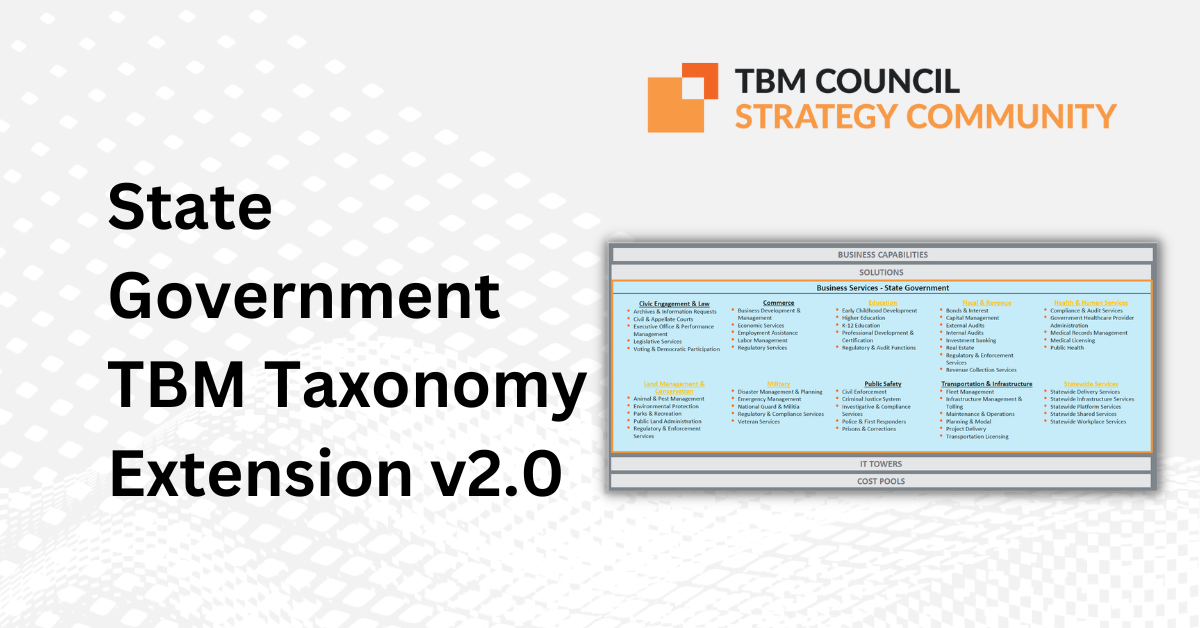 The State Government TBM Taxonomy extension extends the standard TBM framework to cater specifically to the needs of state government operations. It has been meticulously crafted by the TBM Council Government Strategy Community as an industry-specific business solutions extension for State Government. This extension acknowledges that IT plays a pivotal role in delivering business solutions that empower the government to effectively engage with its constituents. Within the TBM taxonomy, there exists a foundational set of capabilities applicable to most enterprises, encompassing areas like Product Management, Sales & Marketing, Manufacturing & Delivery, and Customer Service.