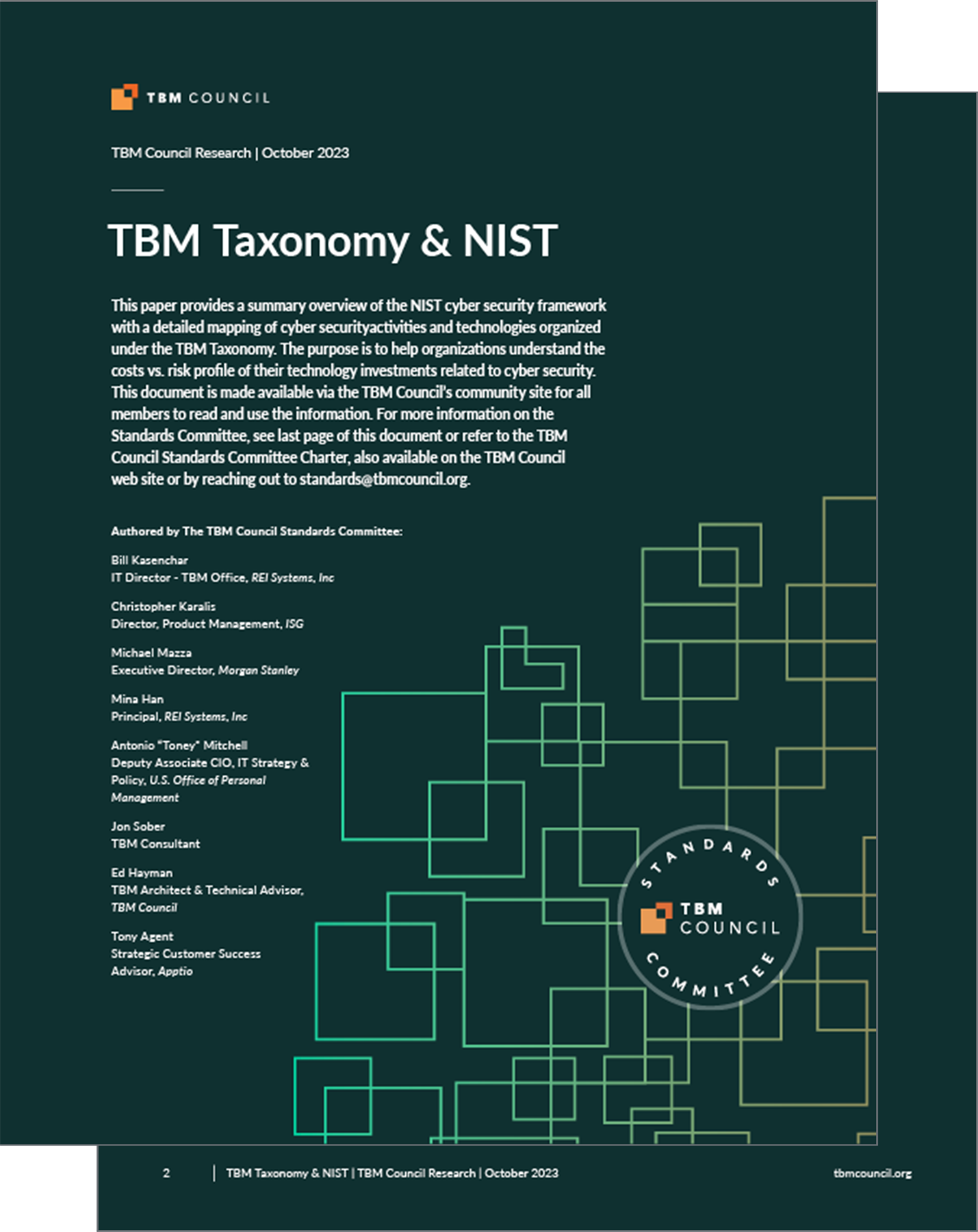 This TBM Taxonomy & NIST Cyber Security guide is one of several assets delivered by the TBM Council Standards Committee workgroup commissioned to develop a complete mapping of the TBM Taxonomy to the NIST framework and inform best practice use. The workgroup’s goal is to allow TBM practices to supplement their models with a variety of contextual data from the NIST framework, and enable insights into cost vs risk analysis, investment and position analysis, and potential requirements to achieve target risk profiles, and more. This guide is available to TBM Council members.